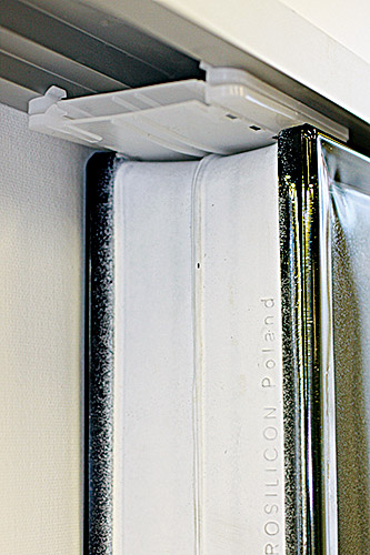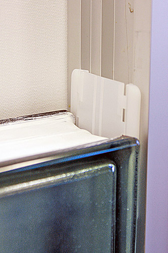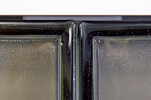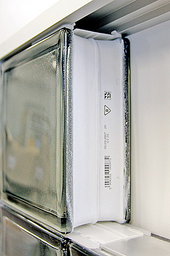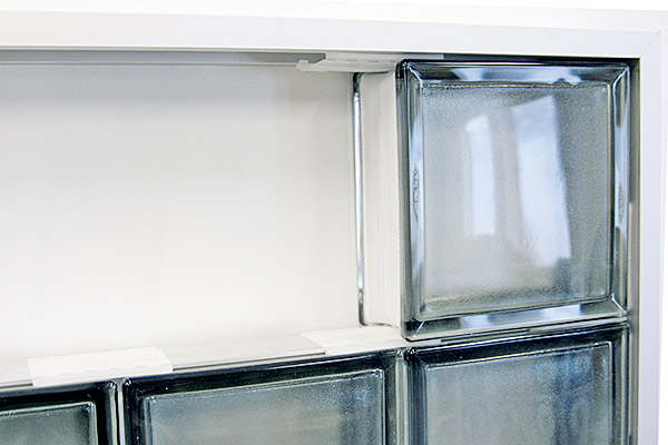 Muovivälike tulee jokaiseen pystysaumaan. (Alumiinikarmin ja lasitiilen väliin, sekä jokaiseen lasitiilen väliseen saumaan)