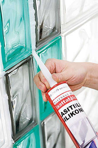 Lopuksi lasitiilen saumat tiivistetään lasitiilisilikoonilla.